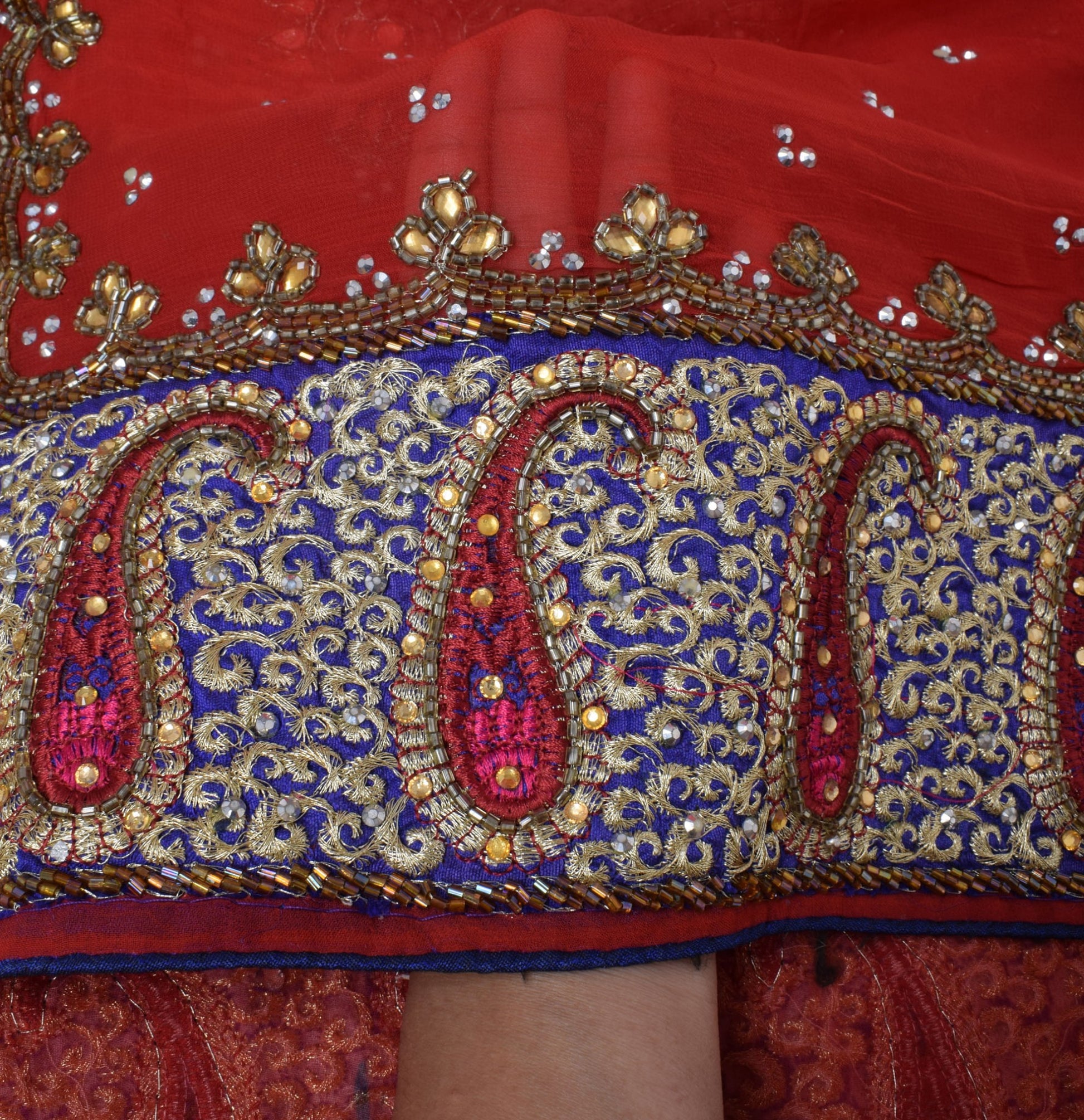 Add a touch of cultural heritage to your collection with this vibrant Red Paisley Dupatta, Scarf, Indian Long Stole, Veil, or Hijab, perfect for festive occasions. Made from premium Pure Georgette Silk, this piece features intricate Beaded, Glass Beads, Patch Work & Embroidered work, adding a touch of traditional charm to any outfit. The Red base beautifully complements the delicate Paisley detailing, creating a truly timeless accessory.