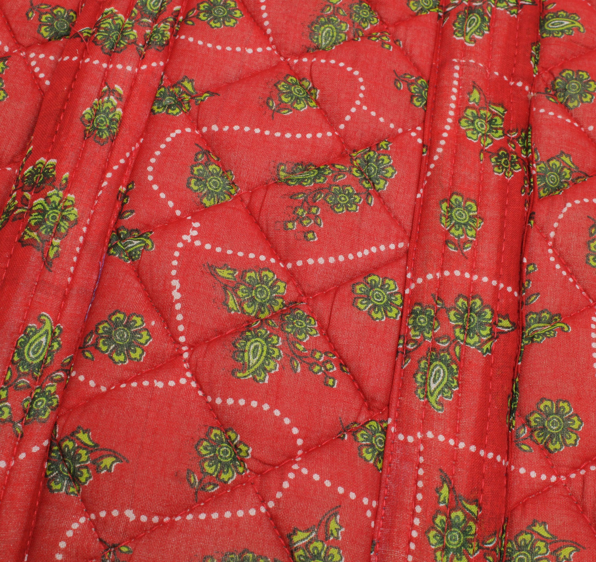 The outer fabric is 100% Pure Silk Printed Saree Fabric quilted with Foam and, Middle layer uses water resistant fabric and the inner layer uses Roto Fabric.