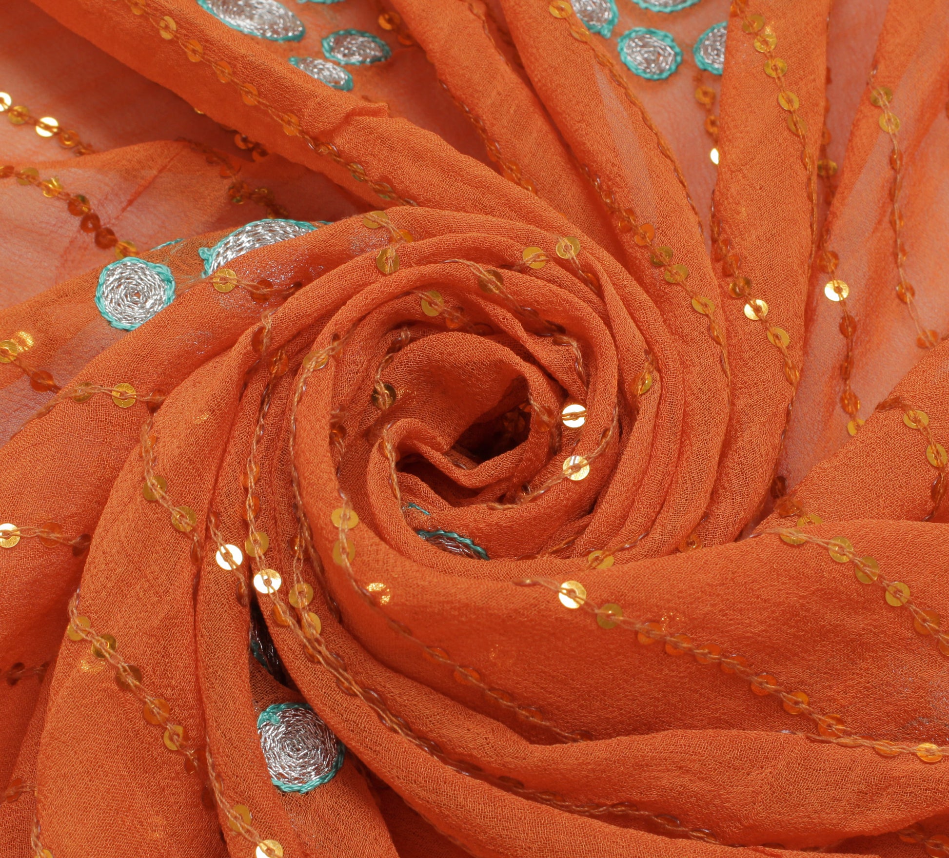 Add a touch of cultural heritage to your collection with this vibrant Rust Floral Dupatta, Scarf, Indian Long Stole, Veil, or Hijab, perfect for festive occasions. Made from premium Pure Georgette Silk, this piece features intricate Sequins Embroidered work, adding a touch of traditional charm to any outfit. The Rust base beautifully complements the delicate Floral detailing, creating a truly timeless accessory.