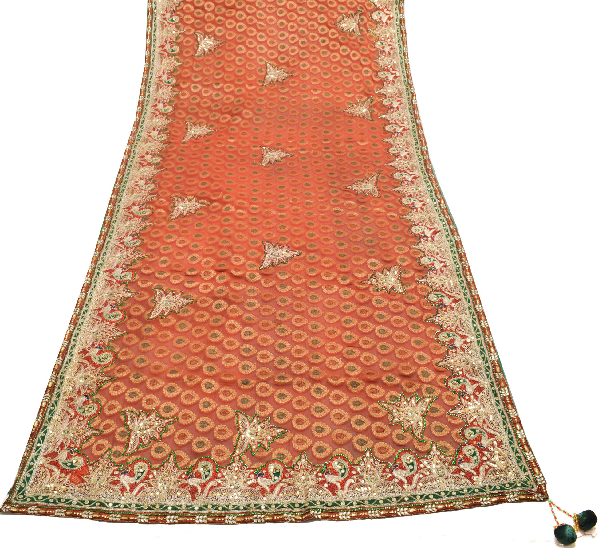 Sushila Vintage Rust & Green HEAVY Saree Blend Georgette Hand Beaded Sari Fabric