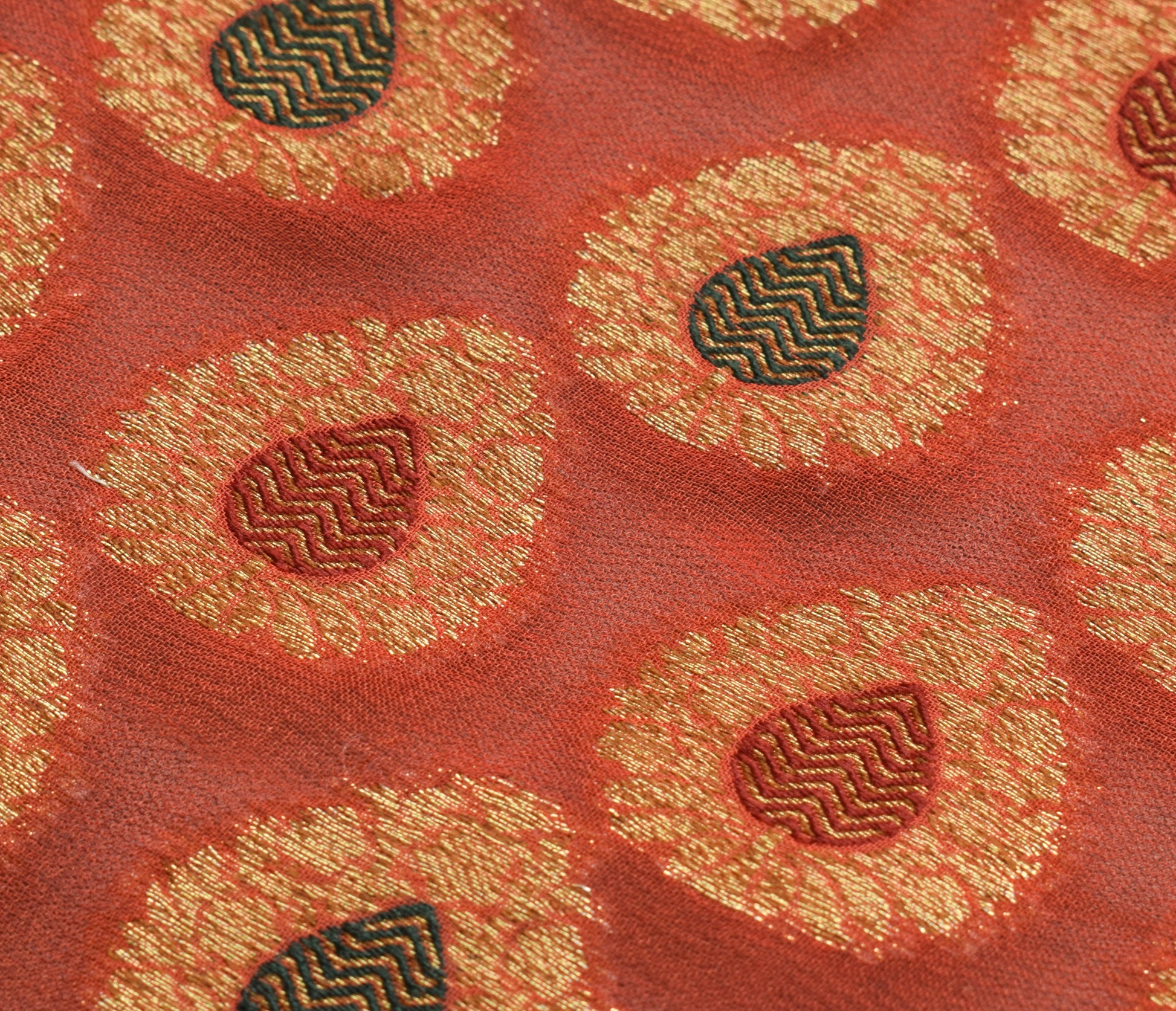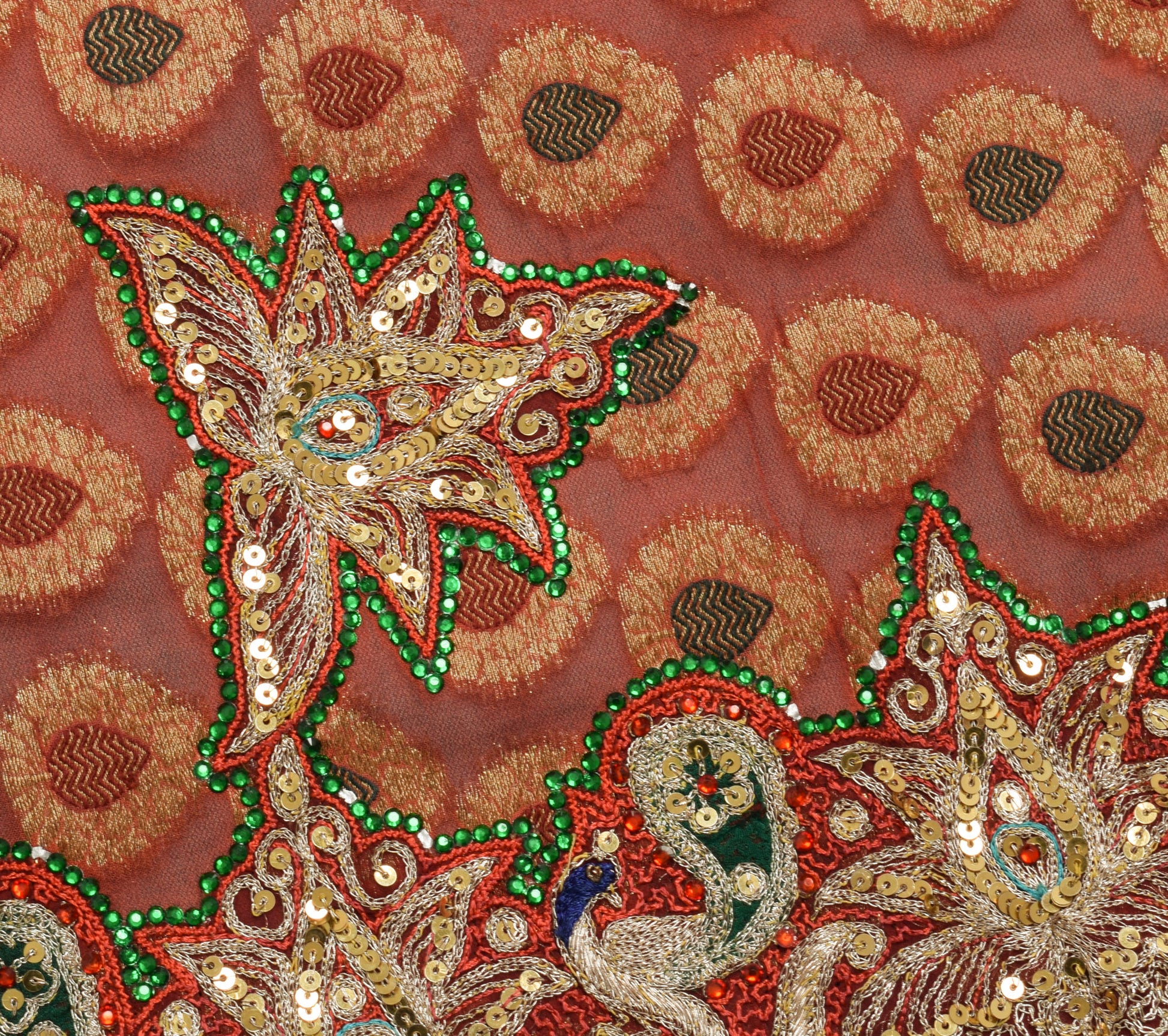 Capture the spirit of heritage fashion with this rust & green blend georgette silk & net mesh saree, showcasing stunning floral motifs and artistic hand beaded zardozi work, sequins work, rhine stone, zari work, woven & embroidered embellishments. Measuring approximately 196 inch in length and 44 inch in width, this sari provides a generous amount of fabric for versatile styling. It weighs just 1410 grams (actual product weight), making it a comfortable choice for long wear. this sari is carefully finished, with fall attached and pico done, ensuring a polished, ready-to-wear look. Whether worn traditionally, upcycled into beautiful home décor, or transformed into unique dresses, this sari is a versatile addition to your collection.
