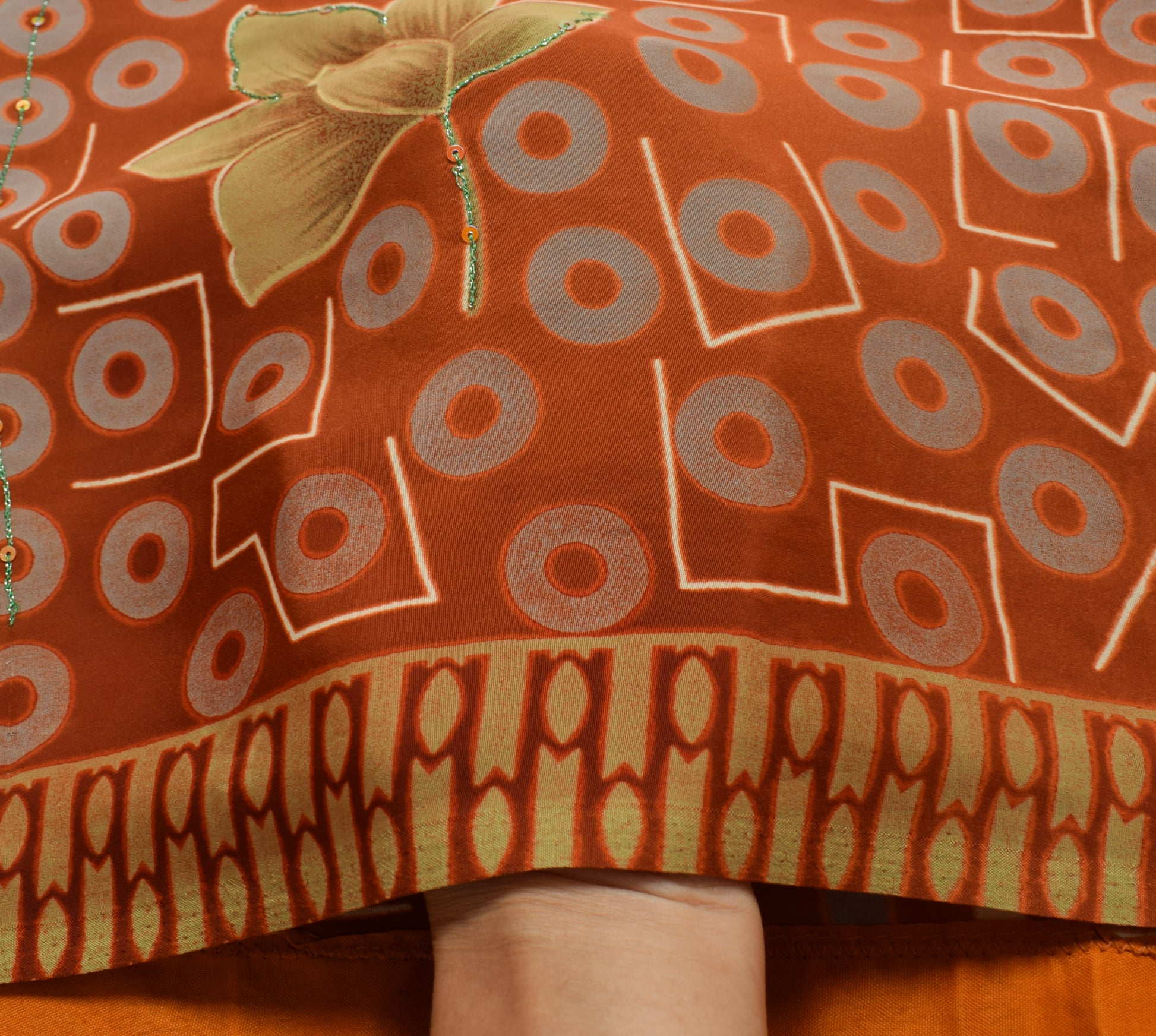 Add classic charm to your collection with this rust blend crepe silk saree, highlighted by its floral motif and fine printed artistry. Crafted from pure, breathable blend crepe silk, this sarI boasts a luxurious drape and enduring appeal. Measuring roughly 204 inch in length and 43 inch in width, it offers versatile styling—whether worn traditionally or repurposed into bespoke dresses, home décor, or creative crafts. Weighing about 455 grams (actual product weight), it falls gracefully, making it ideal for anyone who appreciates the charm of vintage textiles.