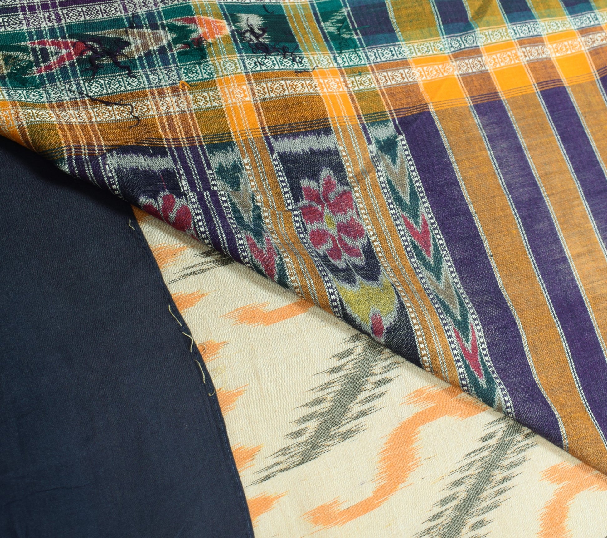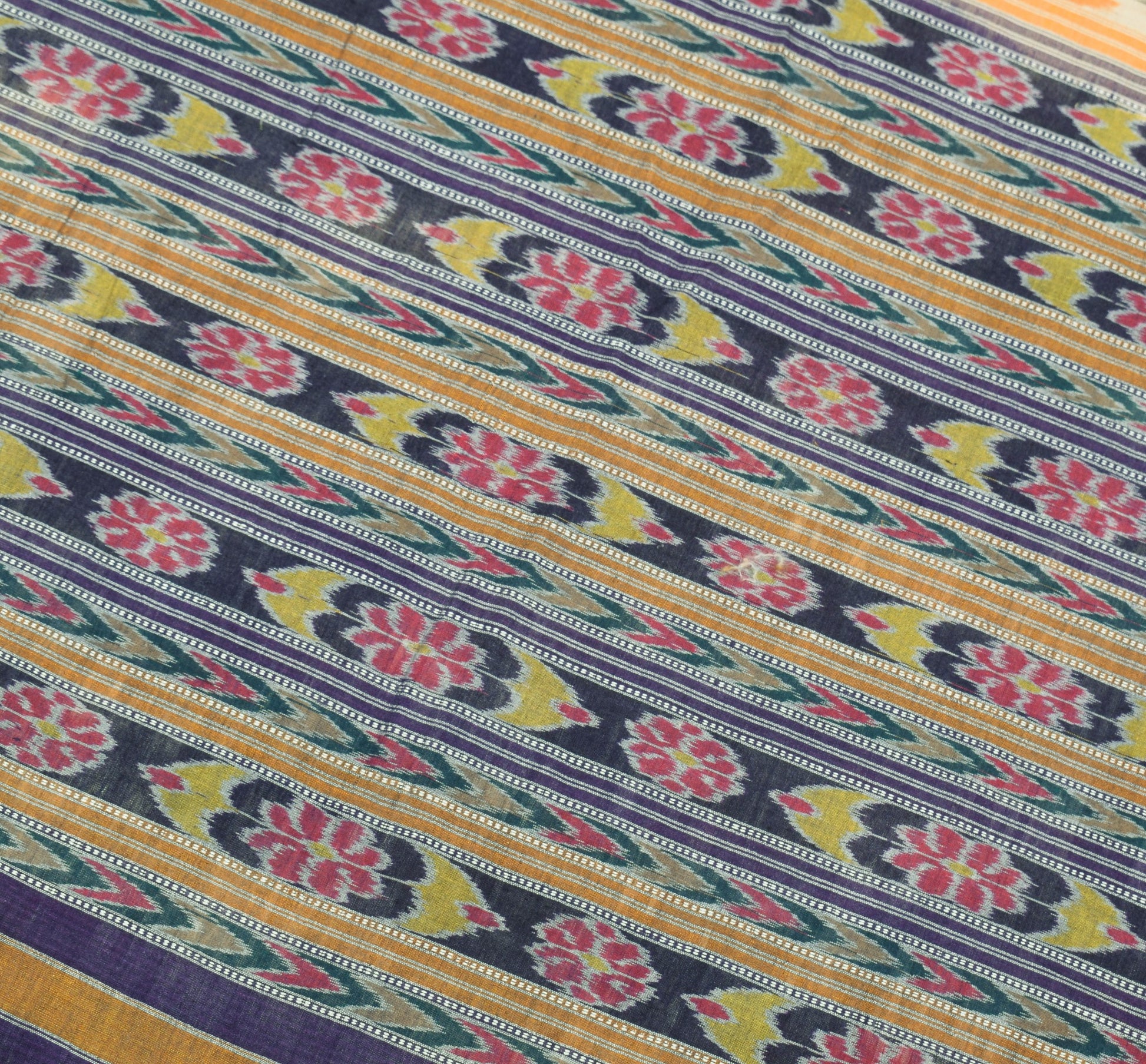 A rare, handwoven gem from northern Odisha, this Sushila vintage single Ikat saree is crafted from 100% pure cotton. Featuring a cream base with multicolor floral Ikat work on the pallu and border, and intricate threadwork in the center, this saree reflects the artistry of traditional Sambalpuri weaving.
