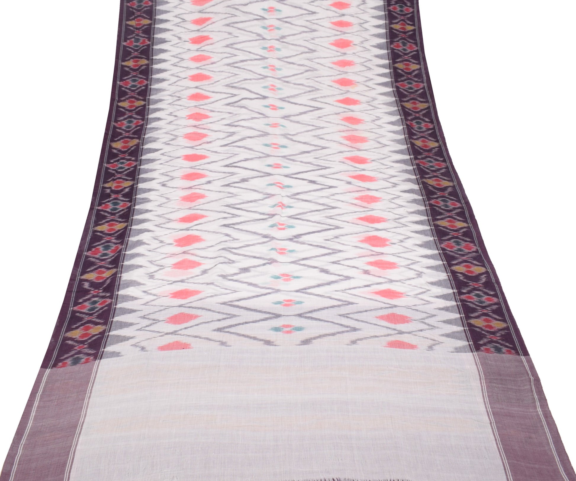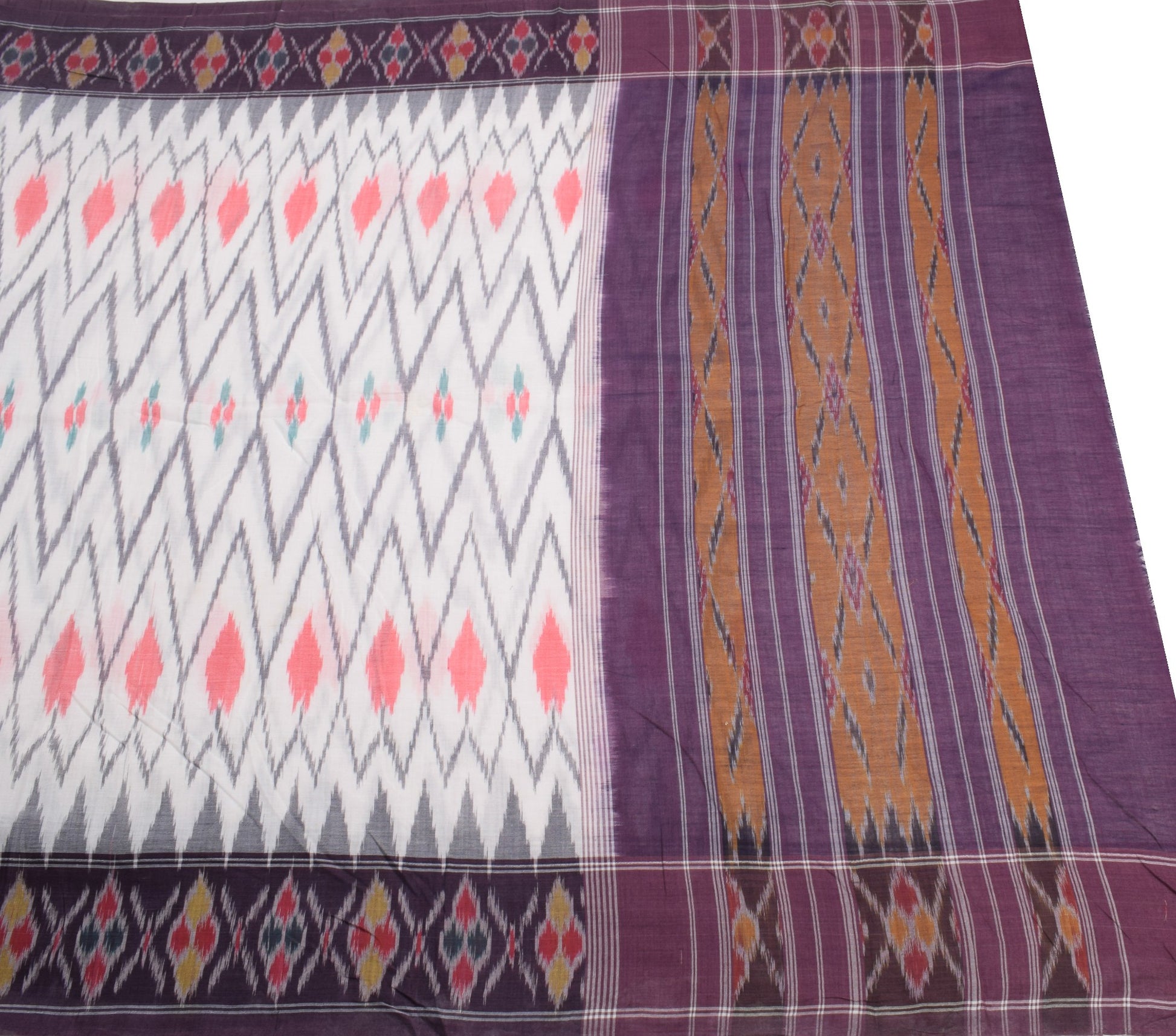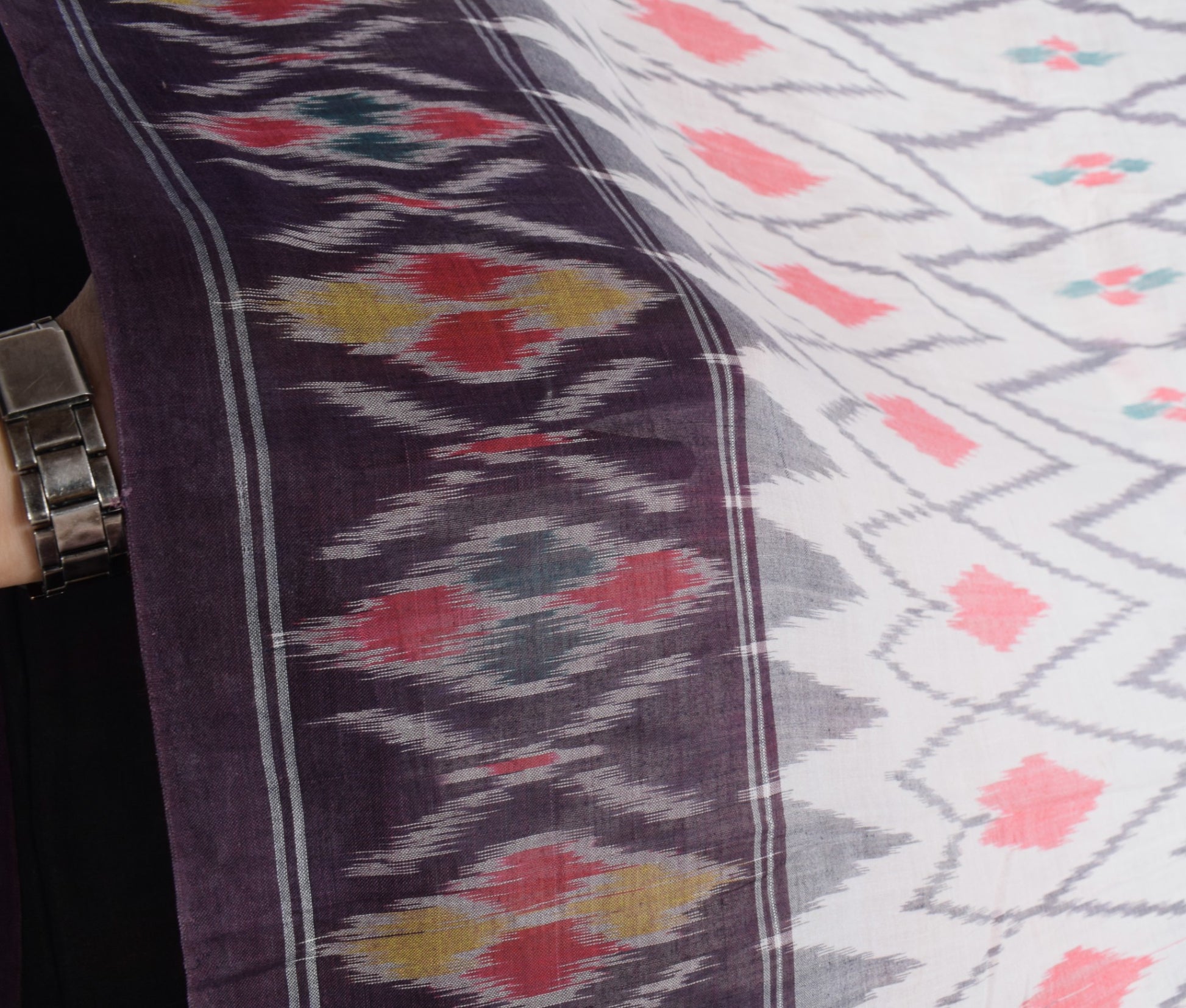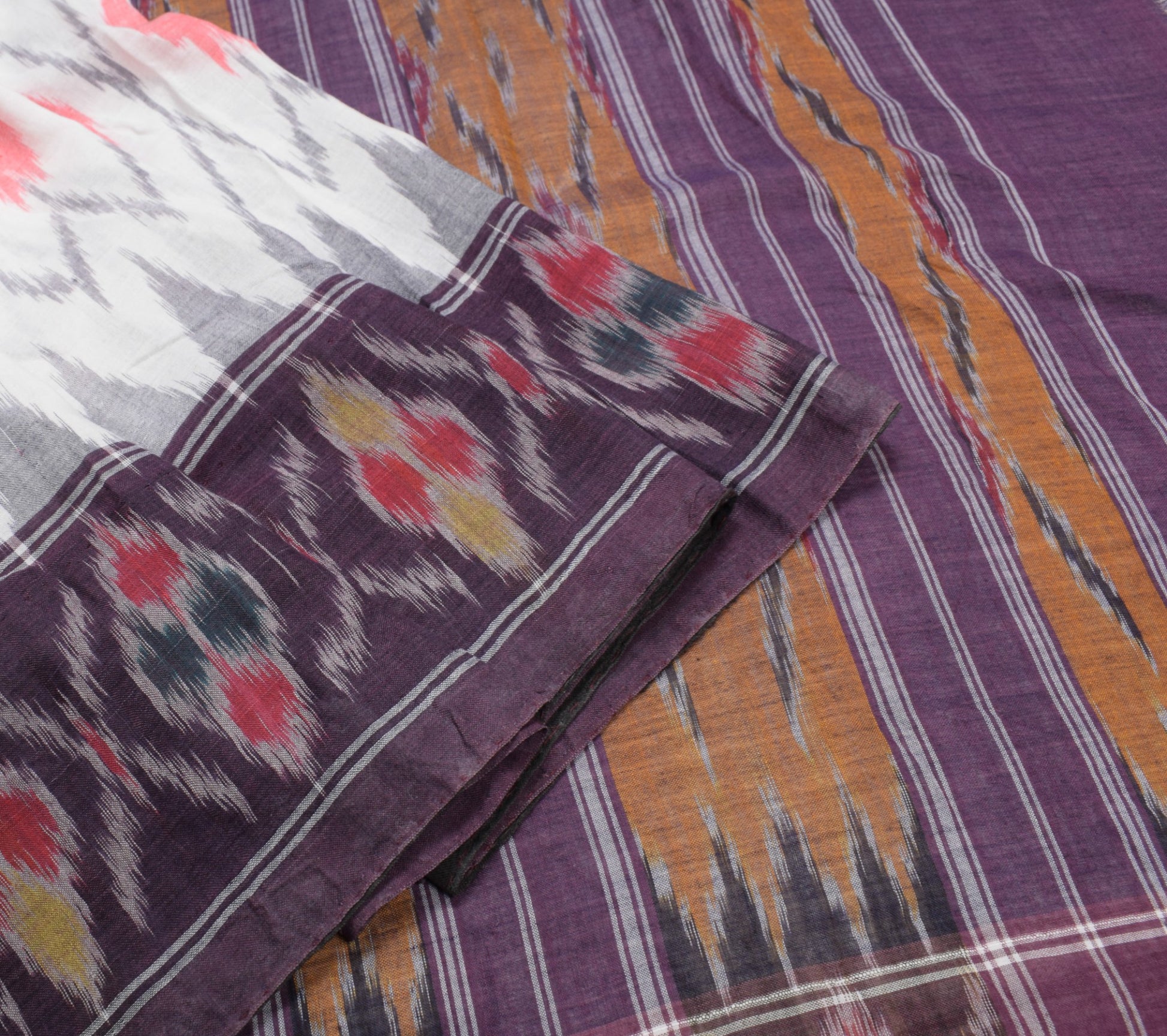 Celebrate the rich weaving heritage of Odisha with this exquisite Sambalpuri Ikat saree, crafted from 100% pure cotton. Featuring a crisp white base beautifully contrasted with a deep purple border and pallu, this saree showcases the iconic Sambalpuri Ikat pattern, meticulously hand-woven by skilled artisans.