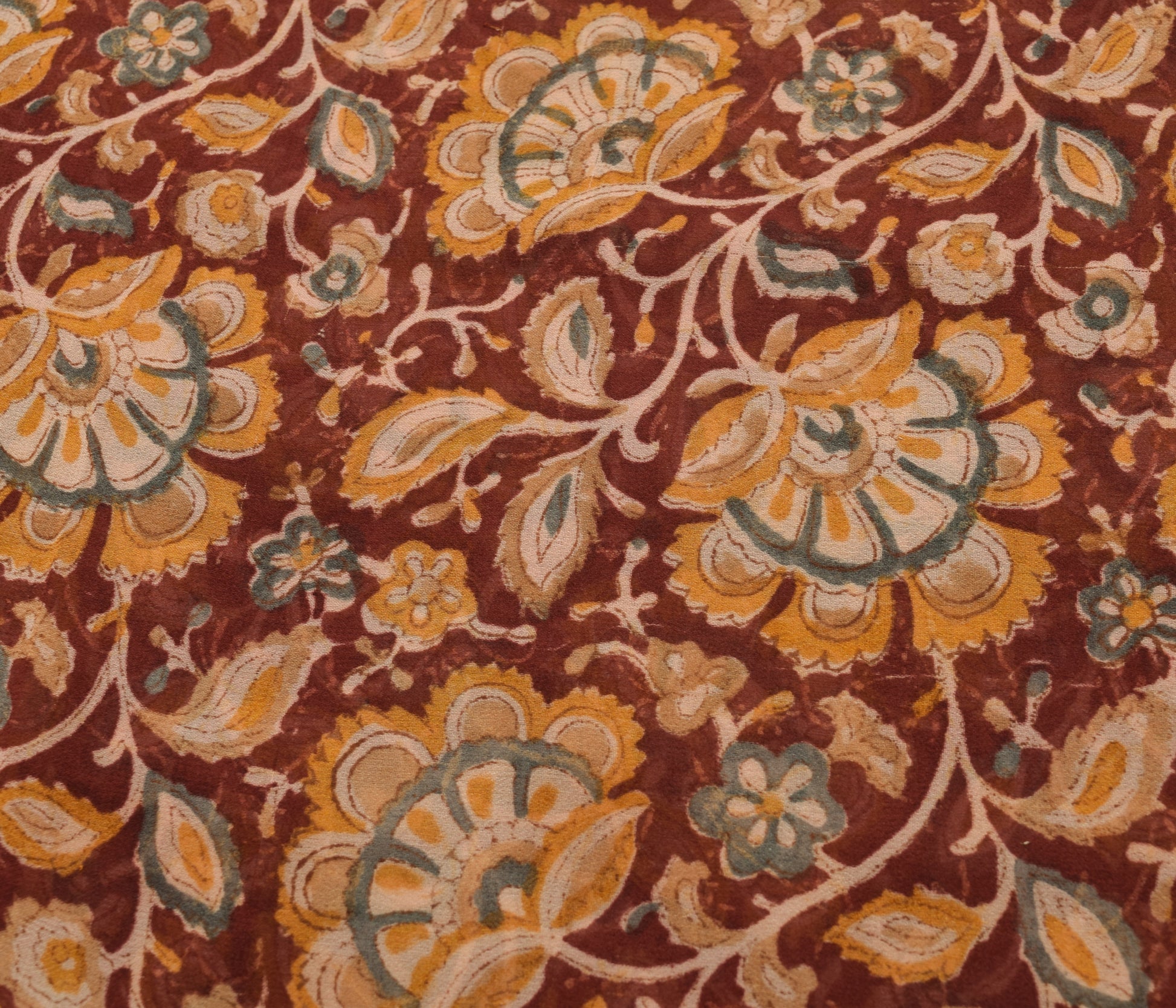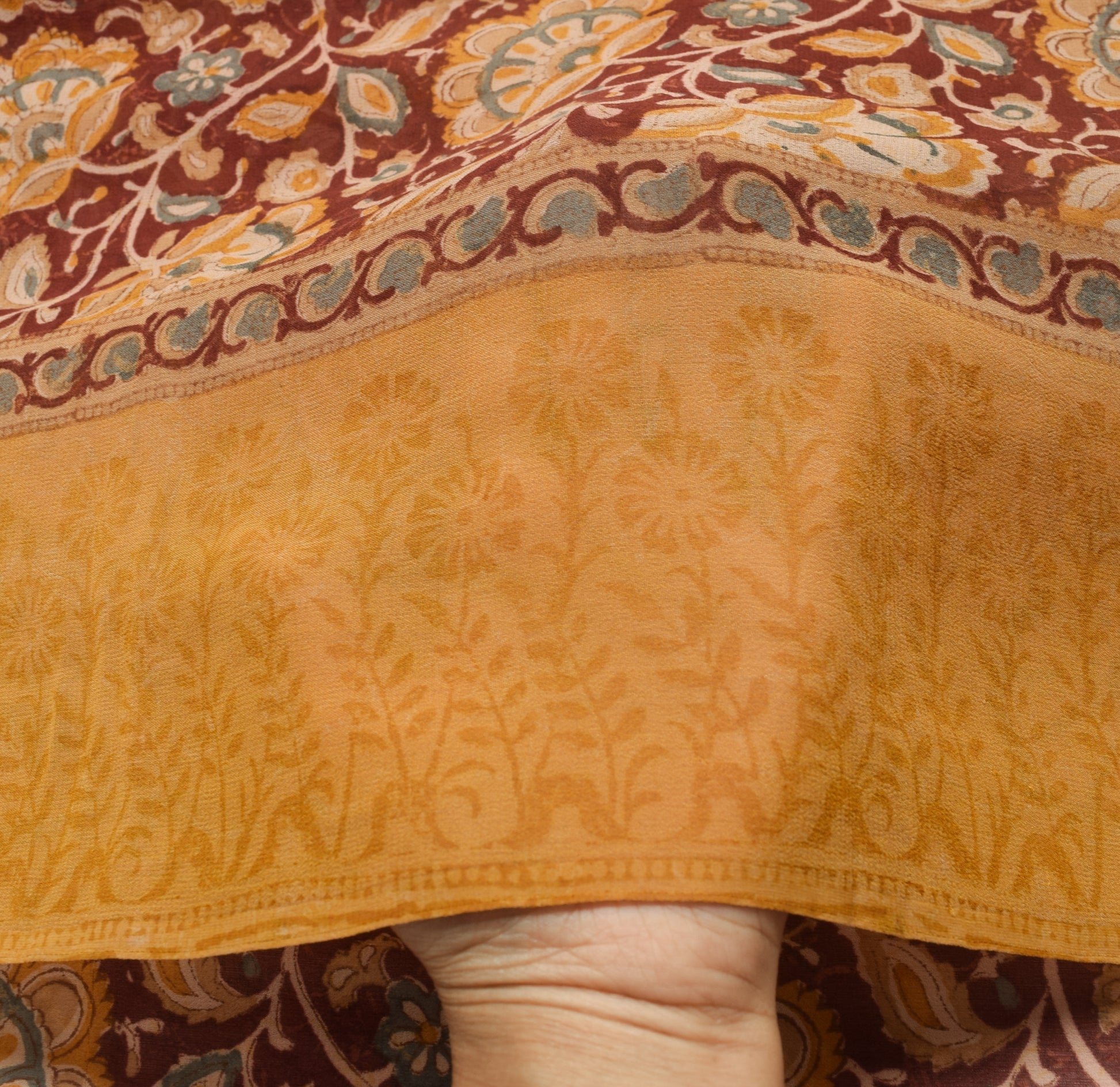 Embrace the charm of vintage textiles with this Maroon 100% Pure Georgette Silk saree, showcasing graceful Floral motifs and intricate Hand Block Printed embellishments. It is perfect for special occasions, creative repurposing, or as a beautiful heirloom gift. Measuring approximately 190 Inch in length and 44 Inch in width, this sari offers versatile styling options. It is lightweight, weighing just 340 Grams (Actual Product weight), making it easy to drape and carry for long hours. The natural breathability and luxurious drape of 100% pure georgette silk make it a prized choice for those who appreciate fine craftsmanship and vintage fashion.