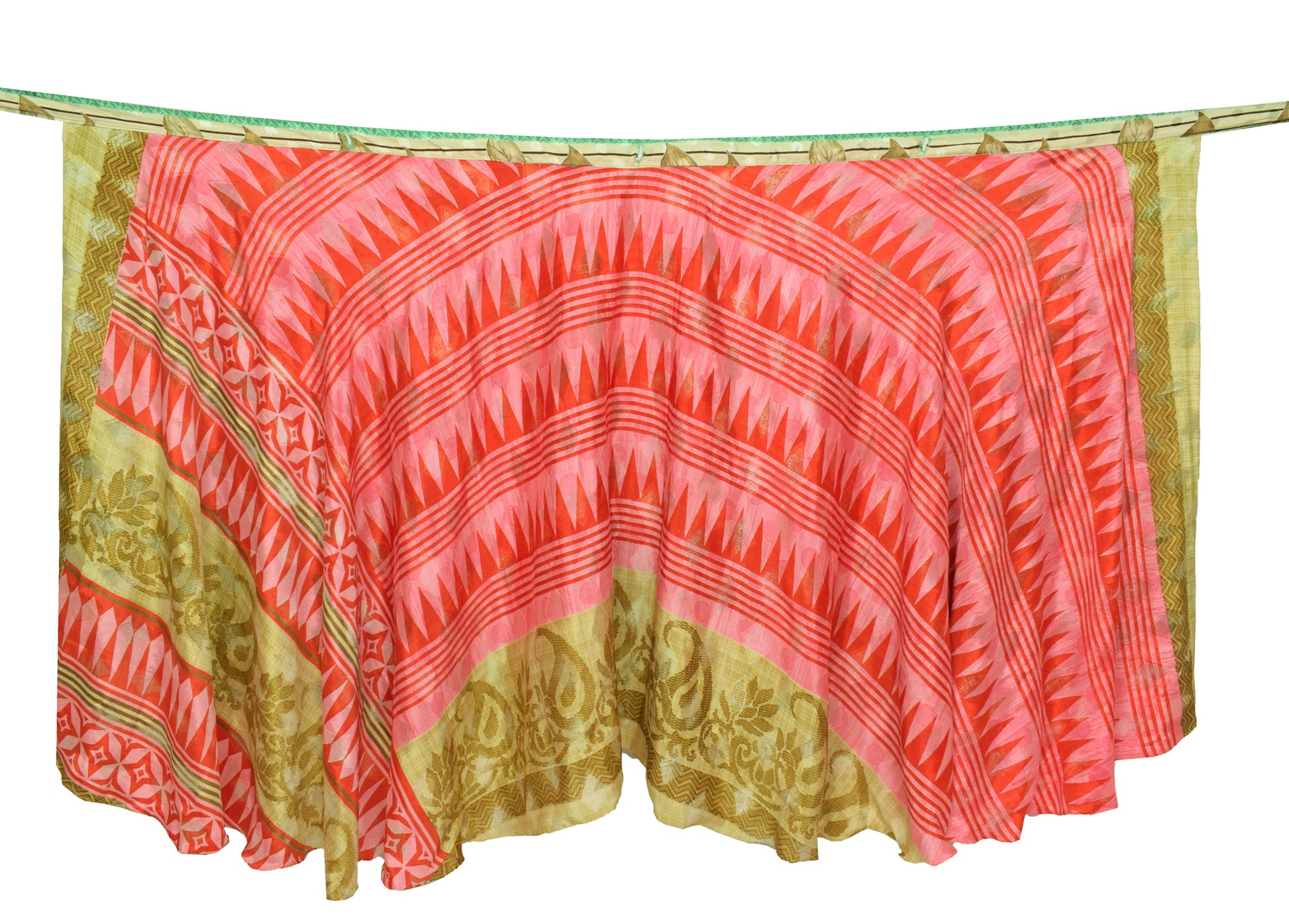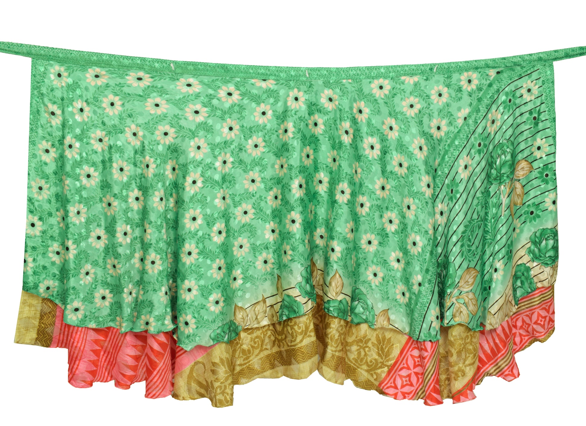 This reversible 2‑Layer Magic Wrap Skirt is crafted from pre‑owned vintage Art or Artificial Silk saree fabric, showcasing a charming green floral pattern for a perfect blend of style and sustainability. Ideal for beach outings, casual wear, or versatile styling, these skirts are lightweight, comfortable, and uniquely patterned. The vibrant designs and flowing fabric make them ideal for pairing with shirts, T‑shirts, or Kurtis. These skirts can be styled in multiple ways, offering endless possibilities for fashion enthusiasts. For styling ideas, simply search for "magic wrap skirt tutorial" on YouTube.
