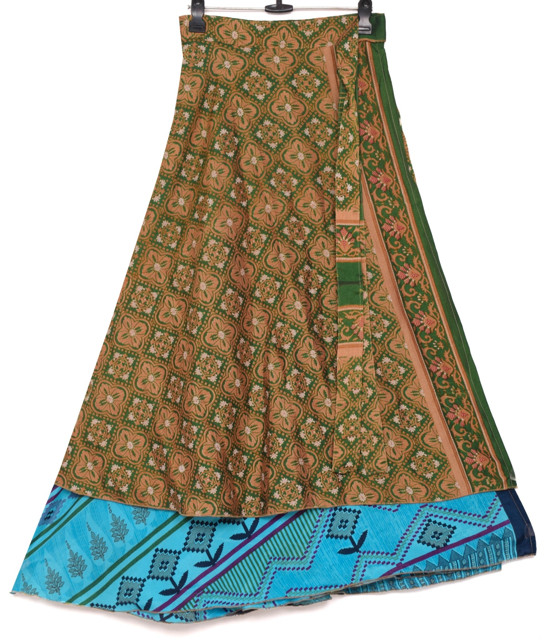 This reversible 2‑Layer Magic Wrap Skirt is crafted from pre‑owned vintage Art or Artificial Silk saree fabric, showcasing a charming green & shade of blue floral pattern for a perfect blend of style and sustainability. Ideal for beach outings, casual wear, or versatile styling, these skirts are lightweight, comfortable, and uniquely patterned. The vibrant designs and flowing fabric make them ideal for pairing with shirts, T‑shirts, or Kurtis. These skirts can be styled in multiple ways, offering endless possibilities for fashion enthusiasts. For styling ideas, simply search for "magic wrap skirt tutorial" on YouTube.