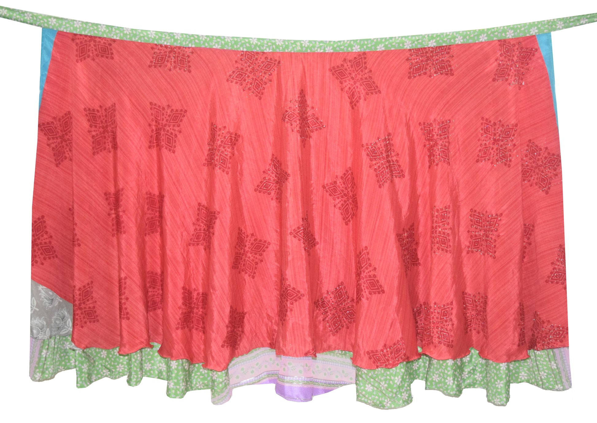 This reversible 2‑Layer Magic Wrap Skirt is crafted from pre‑owned vintage Art or Artificial Silk saree fabric, showcasing a charming green floral pattern for a perfect blend of style and sustainability. Ideal for beach outings, casual wear, or versatile styling, these skirts are lightweight, comfortable, and uniquely patterned. The vibrant designs and flowing fabric make them ideal for pairing with shirts, T‑shirts, or Kurtis. These skirts can be styled in multiple ways, offering endless possibilities for fashion enthusiasts. For styling ideas, simply search for "magic wrap skirt tutorial" on YouTube.