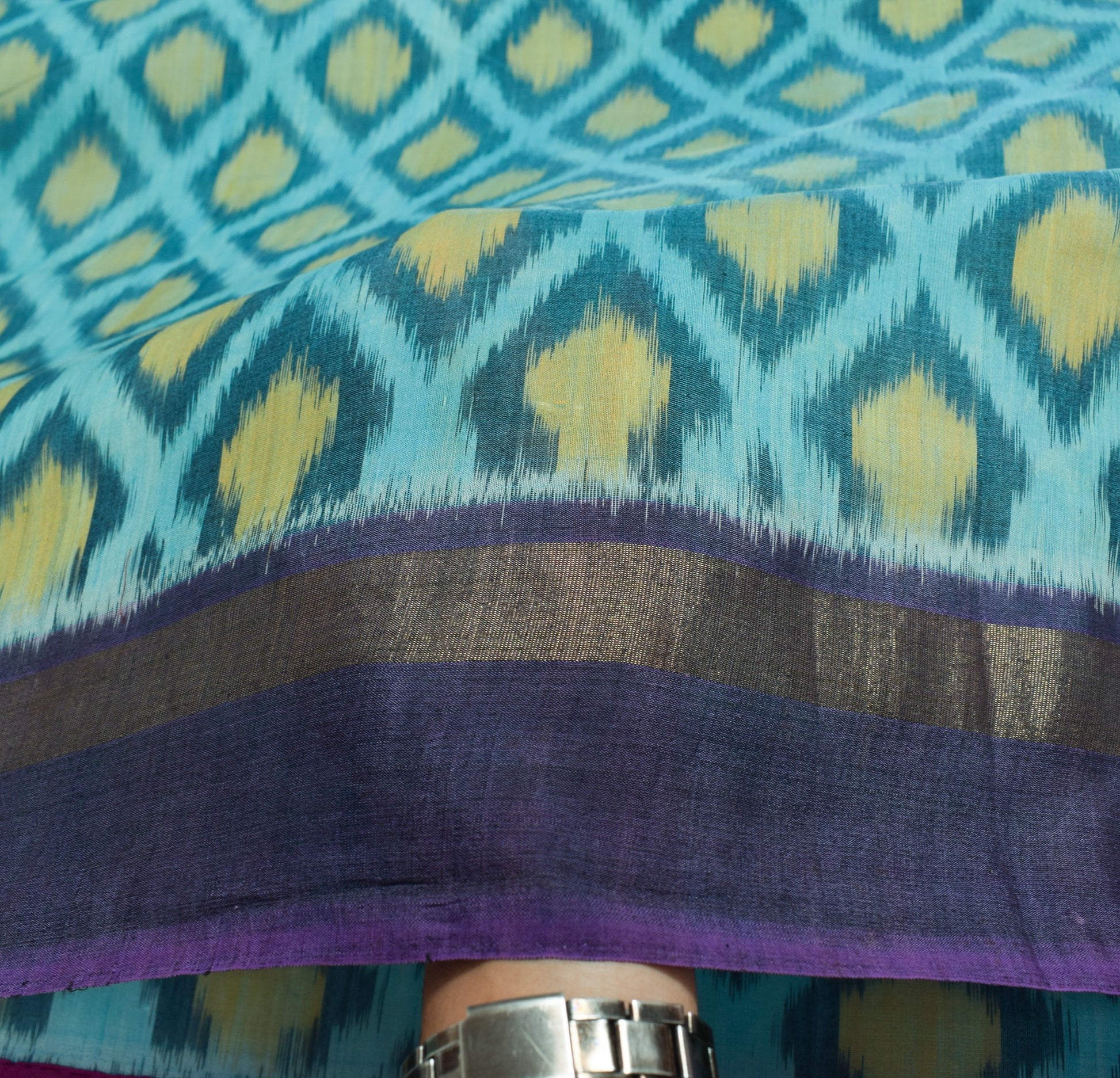 Discover the timeless beauty of this authentic Pochampally Ikat saree, handwoven in India from 100% pure cotton silk. Featuring a graceful sky blue body with a contrasting purple pallu and rich zari brocade border, this saree reflects the exquisite craftsmanship of Telangana’s famed weaving tradition. Lightweight at just 360 grams and finished with fall and pico, it comes in gently used condition, making it a perfect blend of elegance, comfort, and sustainability for festive occasions or graceful everyday wear.