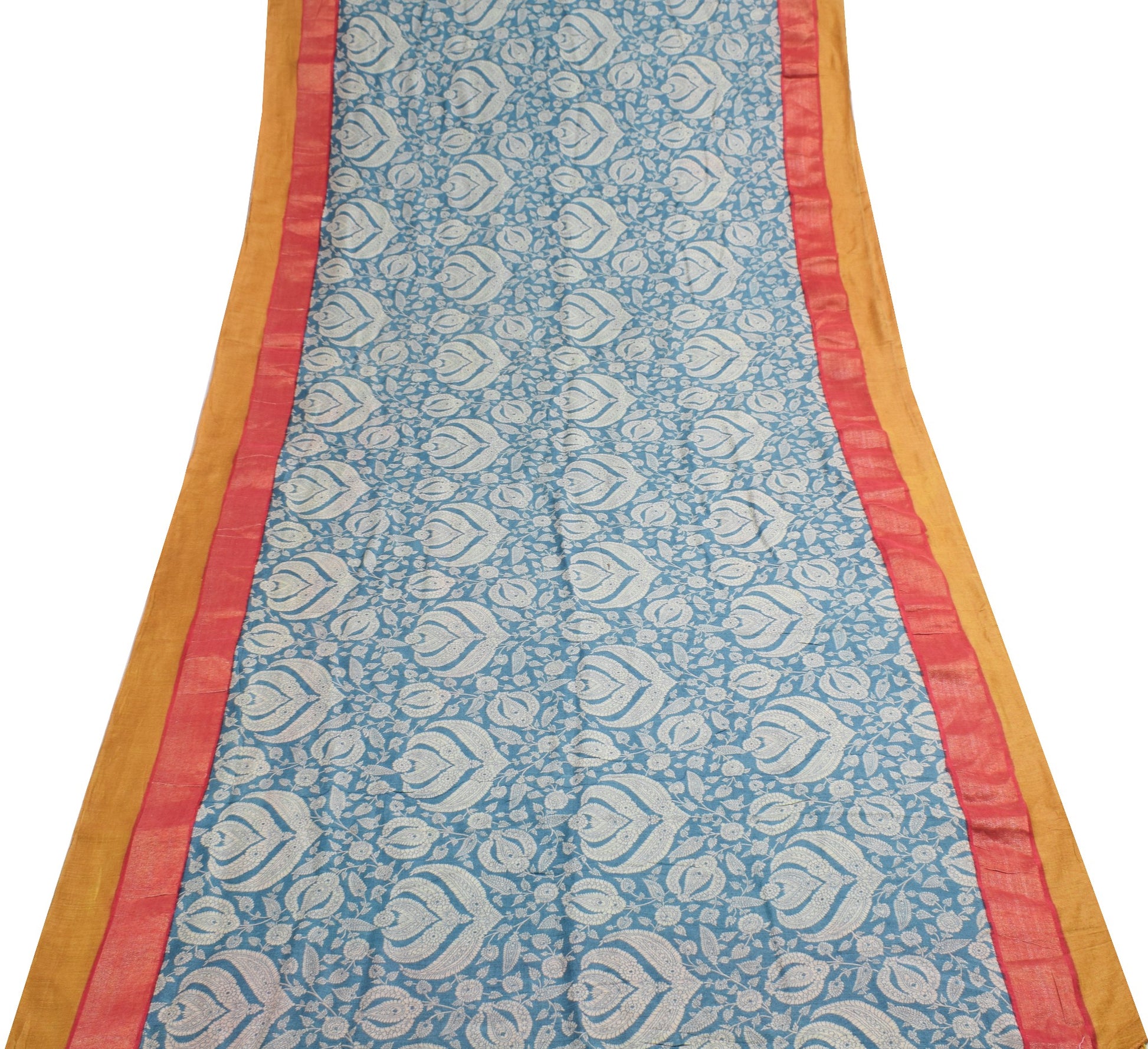 Sushila Vintage Teal Blue Saree Pure Woolen Floral Printed Soft 5YD Sari Fabric