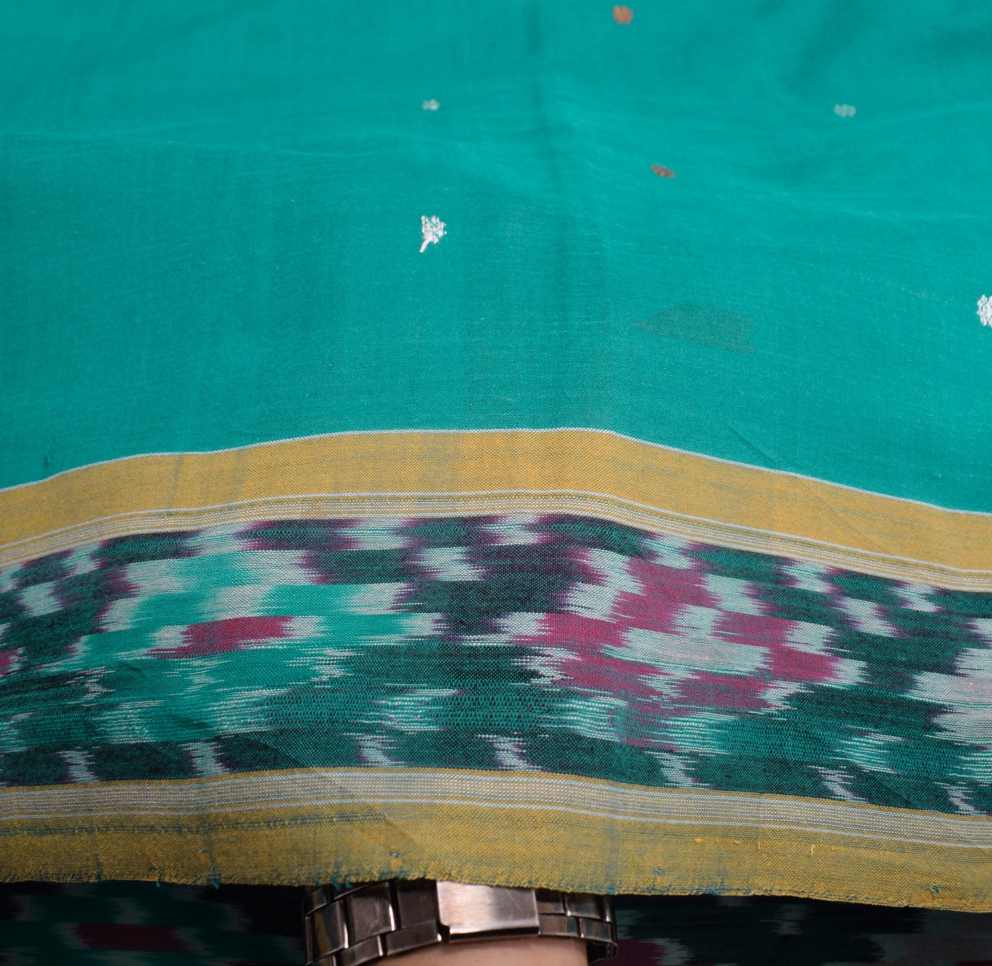 Immerse yourself in the rich heritage of Odisha with this stunning teal Sambalpuri Ikat saree, handwoven from 100% pure cotton. A true piece of wearable art, it features the signature geometric and symbolic patterns of traditional Ikat weaving. Measuring 192 x 45 inches, this pre-loved saree is finished with pico and awaits your personal touch for fall. Lightweight at just 365 grams, it offers both elegance and everyday comfort. Crafted with soul in India, this is more than a saree — it's a story in threads.