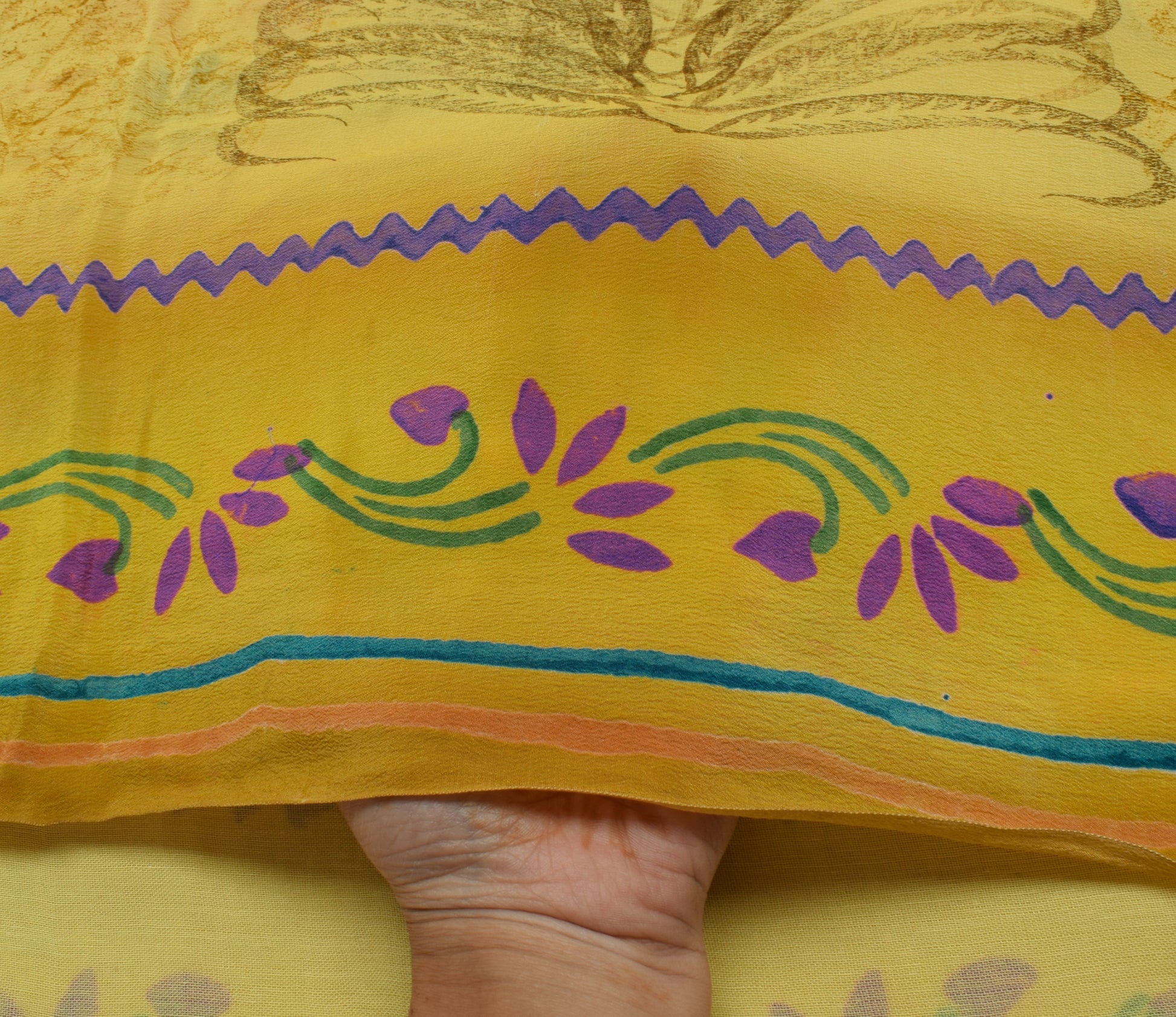 Sushila Vintage Yellow Saree 100% Pure Crepe Silk Printed Floral Soft Fabric