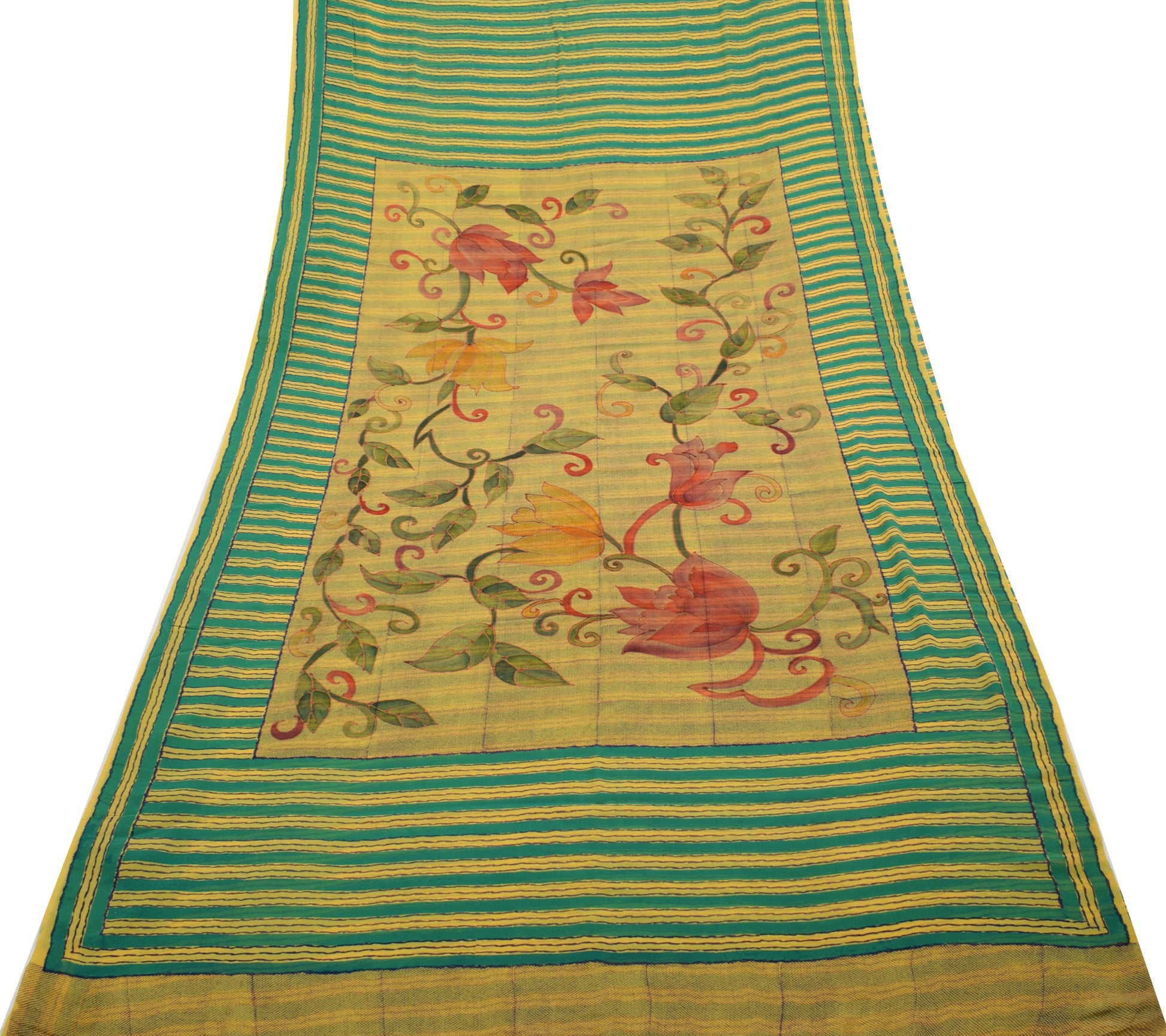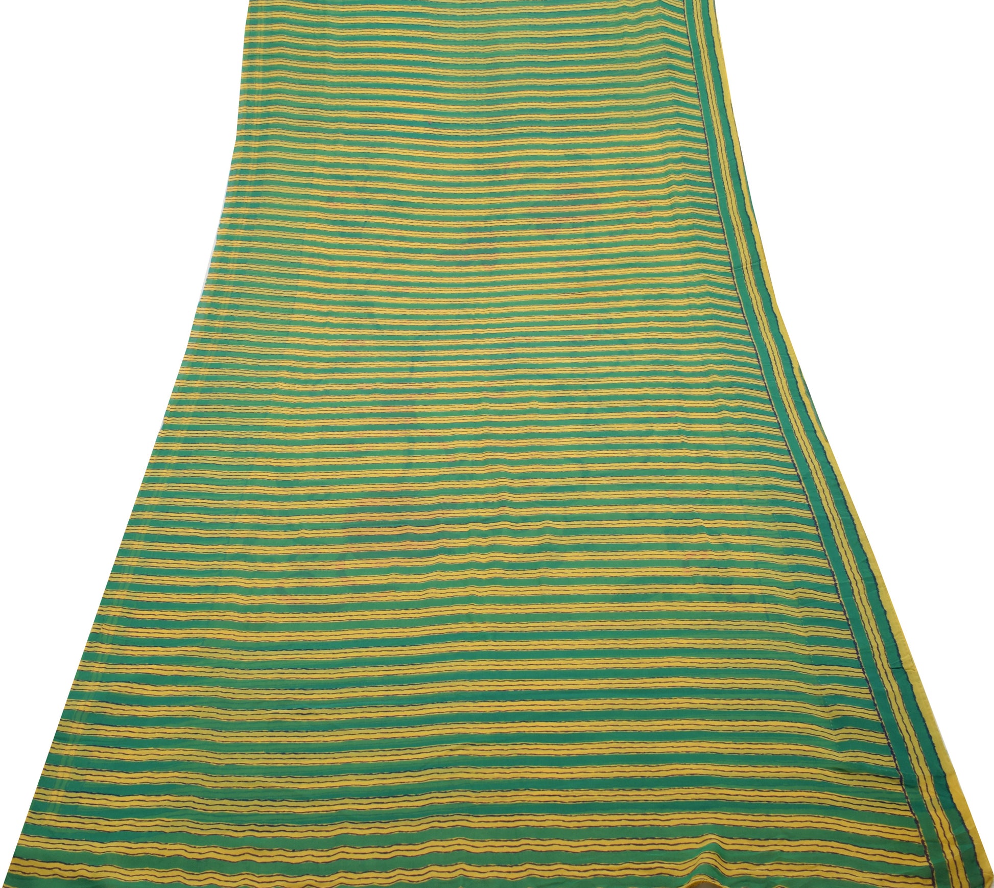 Sushila Vintage Yellow Saree 100%Pure Georgette Silk Printed Strips Craft Fabric