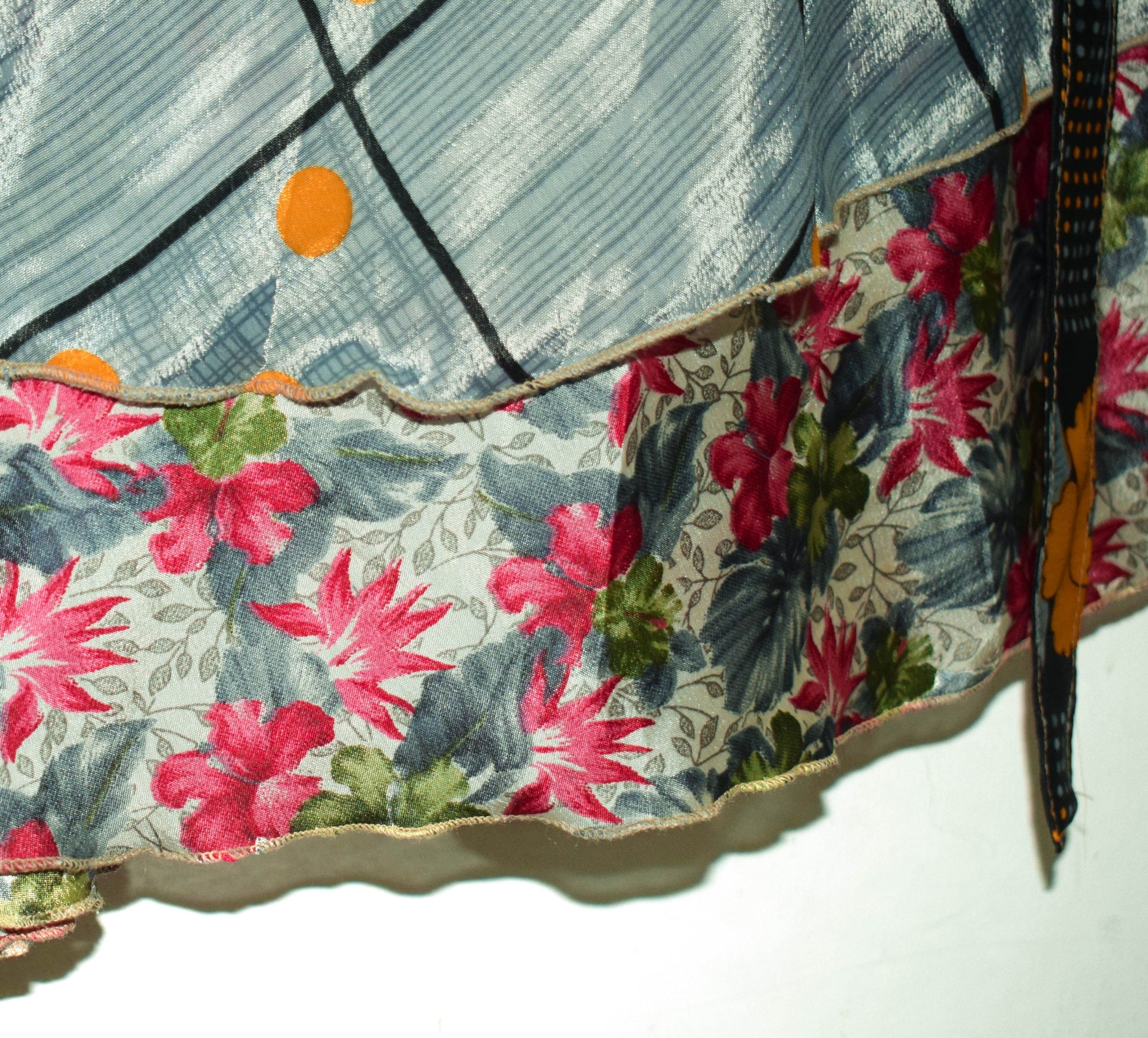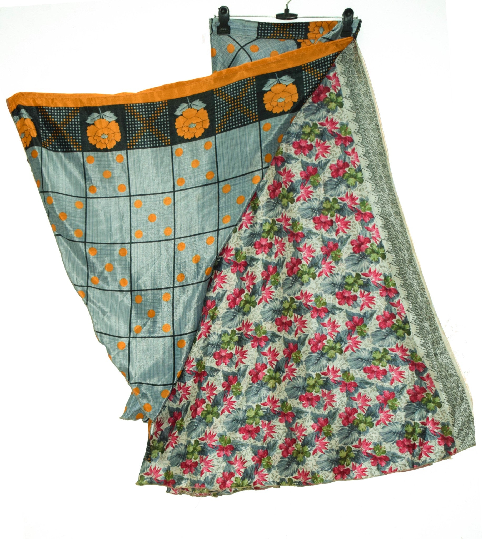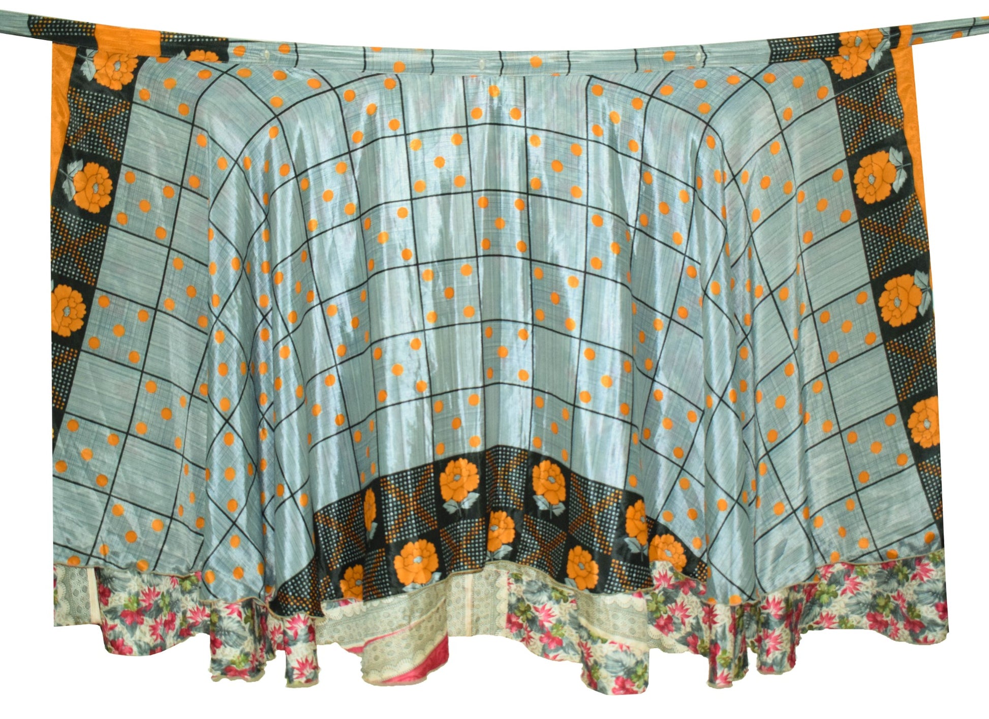 This reversible 2‑Layer Magic Wrap Skirt is crafted from pre‑owned vintage Art or Artificial Silk saree fabric, showcasing a charming white & gray floral pattern for a perfect blend of style and sustainability. Ideal for beach outings, casual wear, or versatile styling, these skirts are lightweight, comfortable, and uniquely patterned. The vibrant designs and flowing fabric make them ideal for pairing with shirts, T‑shirts, or Kurtis. These skirts can be styled in multiple ways, offering endless possibilities for fashion enthusiasts. For styling ideas, simply search for "magic wrap skirt tutorial" on YouTube.