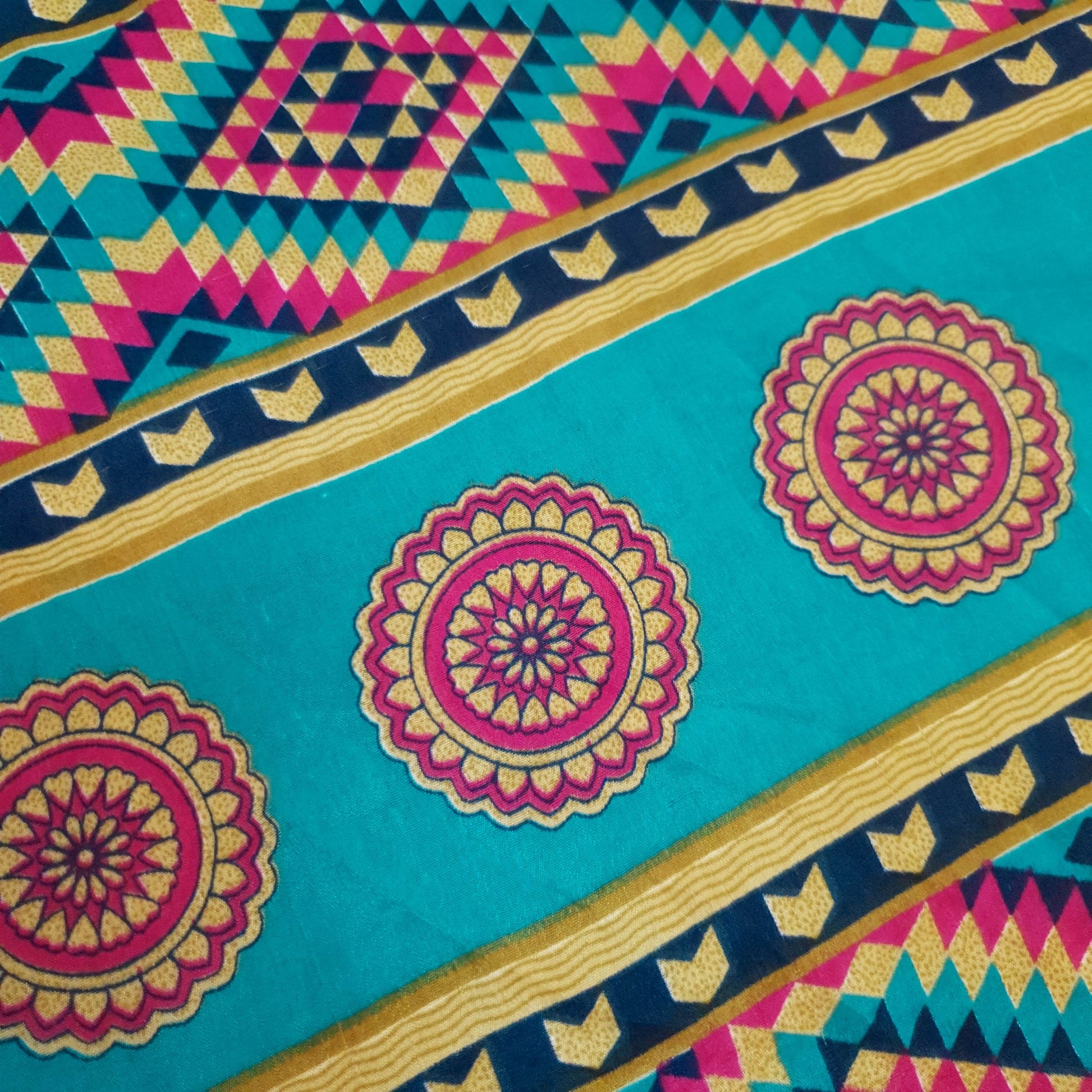 This reversible 2‑Layer Magic Wrap Skirt is crafted from pre‑owned vintage Art or Artificial Silk saree fabric, showcasing a charming turquoise blue human face pattern for a perfect blend of style and sustainability. Ideal for beach outings, casual wear, or versatile styling, these skirts are lightweight, comfortable, and uniquely patterned. The vibrant designs and flowing fabric make them ideal for pairing with shirts, T‑shirts, or Kurtis. These skirts can be styled in multiple ways, offering endless possibilities for fashion enthusiasts. For styling ideas, simply search for "magic wrap skirt tutorial" on YouTube.